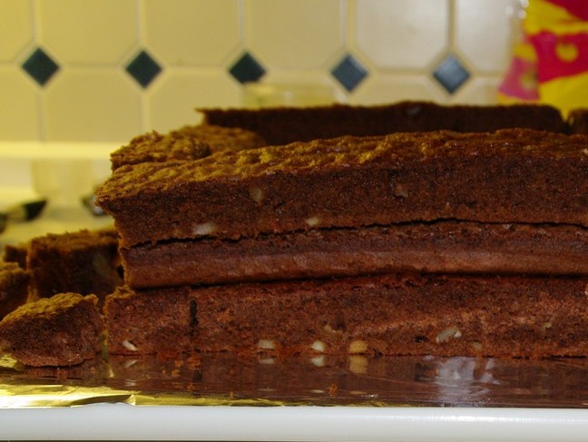 ![]() So erhaltet ihr die Grundform der Burg und gleichzeitig das Material für die Mauern. nun legt ihr außen auf das Rechteck einmal ringsherum zwei Kuchenstreifen übereinander (s. Bild). Die Mauern können mit Marmelade, Schokolade oder Zuckerguss "verklebt" werden. |