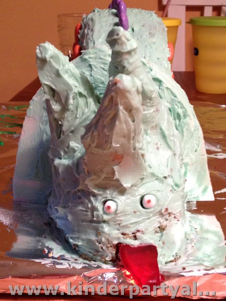Damit der Dino auch dinomäßig aussieht, habe ich ihn mit viel grüner Sahne überzogen.