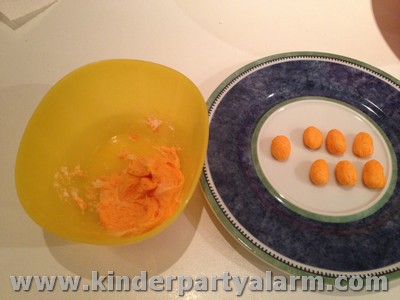 Danach nehmt ihr ein bißchen Fondant oder Marzipan, färbt es orange ein und formt Elmos Nasen. |