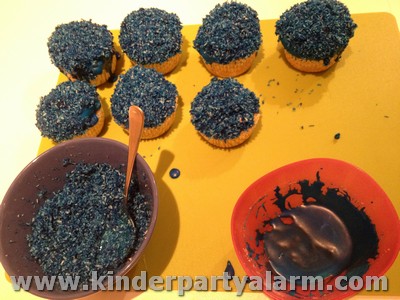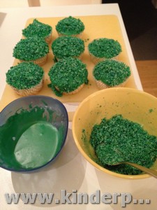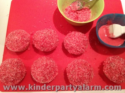 Nun geht es an das Verzieren der kleinen Kuchen. Hierfür stellt ihr blauen, grünen und roten Zuckerguss her, damit das Fell (die Kokosflocken) schön an den Muffins haftet. (Rezept für Zuckerguss)
