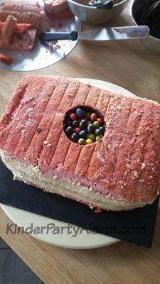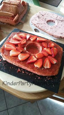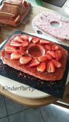 Das passende Auto für einen 6 Jährigen, gefüllt mit Vanille/Erdbeeren Buttercreme, Vollmilch Ganache, frischen Erdbeeren und Smarties.