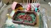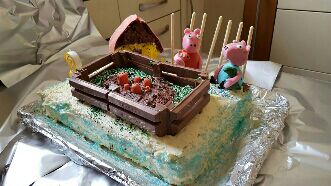 Die Figuren sind aus Fondant und der Zaun um das sich suhlende Schwein ist aus KitKat Riegeln, welche ich angeschmolzen habe, um den Zaun zu befestigen.