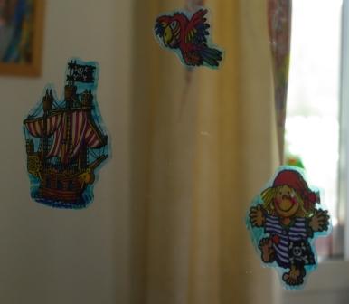 Fensterbilder, die auf einem Spiegel beim Esstisch geklebt werden können.