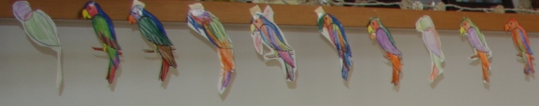 Die Kinder vorher kleine Papageien- Malvorlagen anmalen und ausschneiden lassen. Das ergibt eine schöne Girlande z.B. an einem Regalbord.
