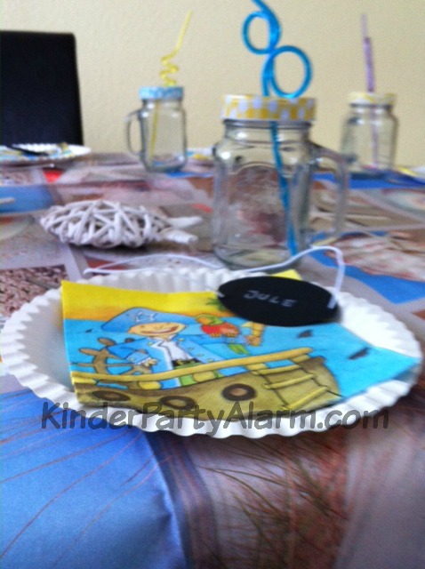 Den Party-Tisch mit Piraten-Geschenkpapier auskleiden und kleine Piraten-Kerzen verteilen.