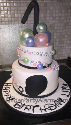 Ringsherum um die Torte sind mühselig mit Hand gerollte Fondantkugeln. Die ganz kleinen sind bunte Zuckerperlen. Und oben drauf Gelatinebubbles.