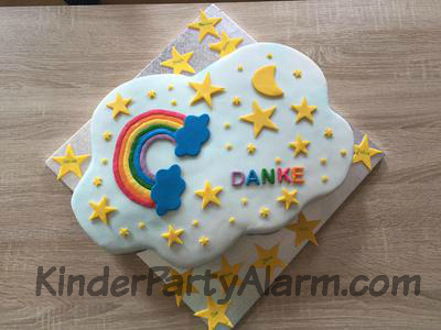 Es ist ein Wunderkuchen mit Quarkcreme mit weisser Ganache bezogen. Der Regenbogen ist aus Blütenpaste.
